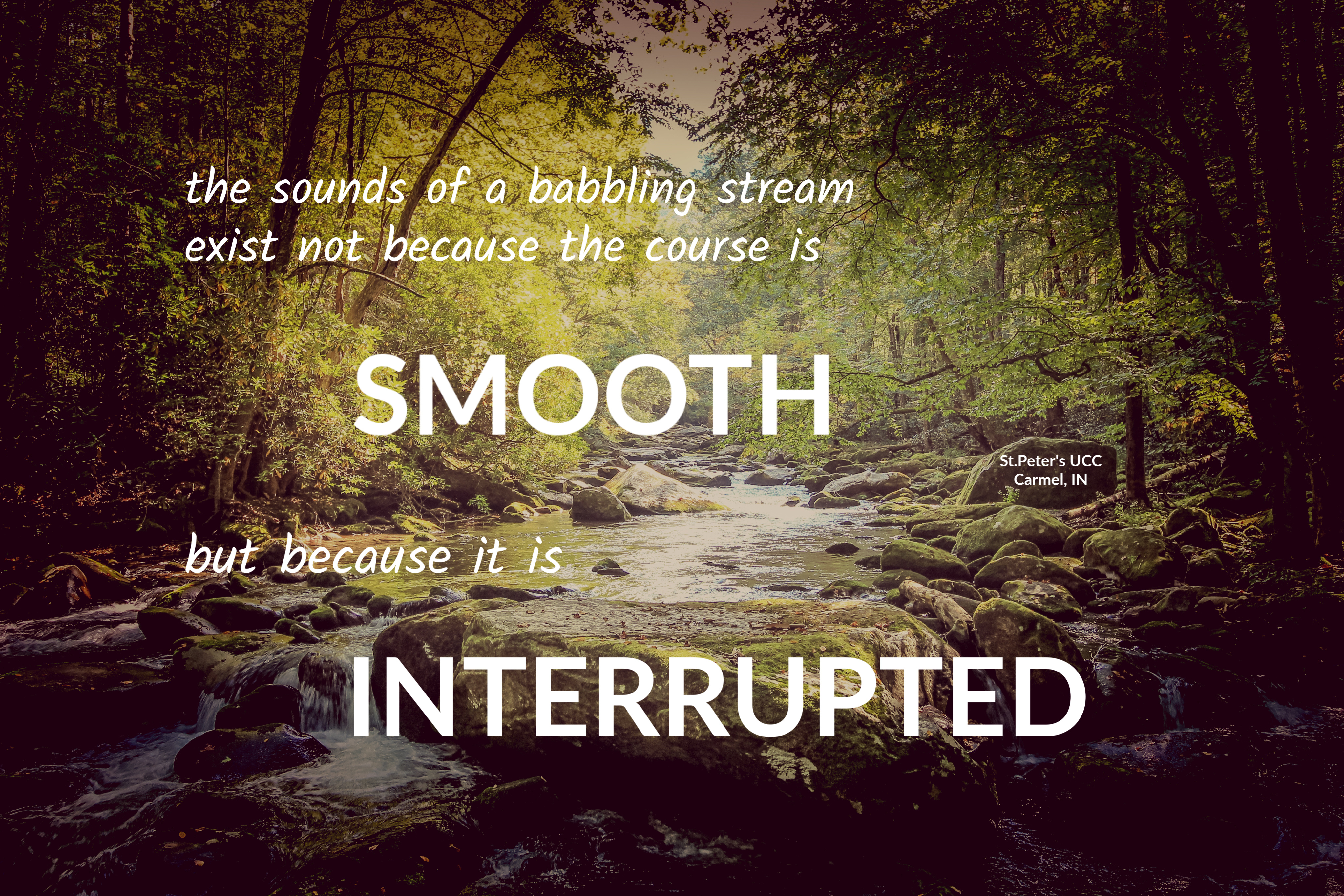 The Spirit, the water, always finds a way. No rock or log will stop it completely. It may change its course or alter its speed, but still the water and Spirit flow. May this be true for your spirit this week as well.