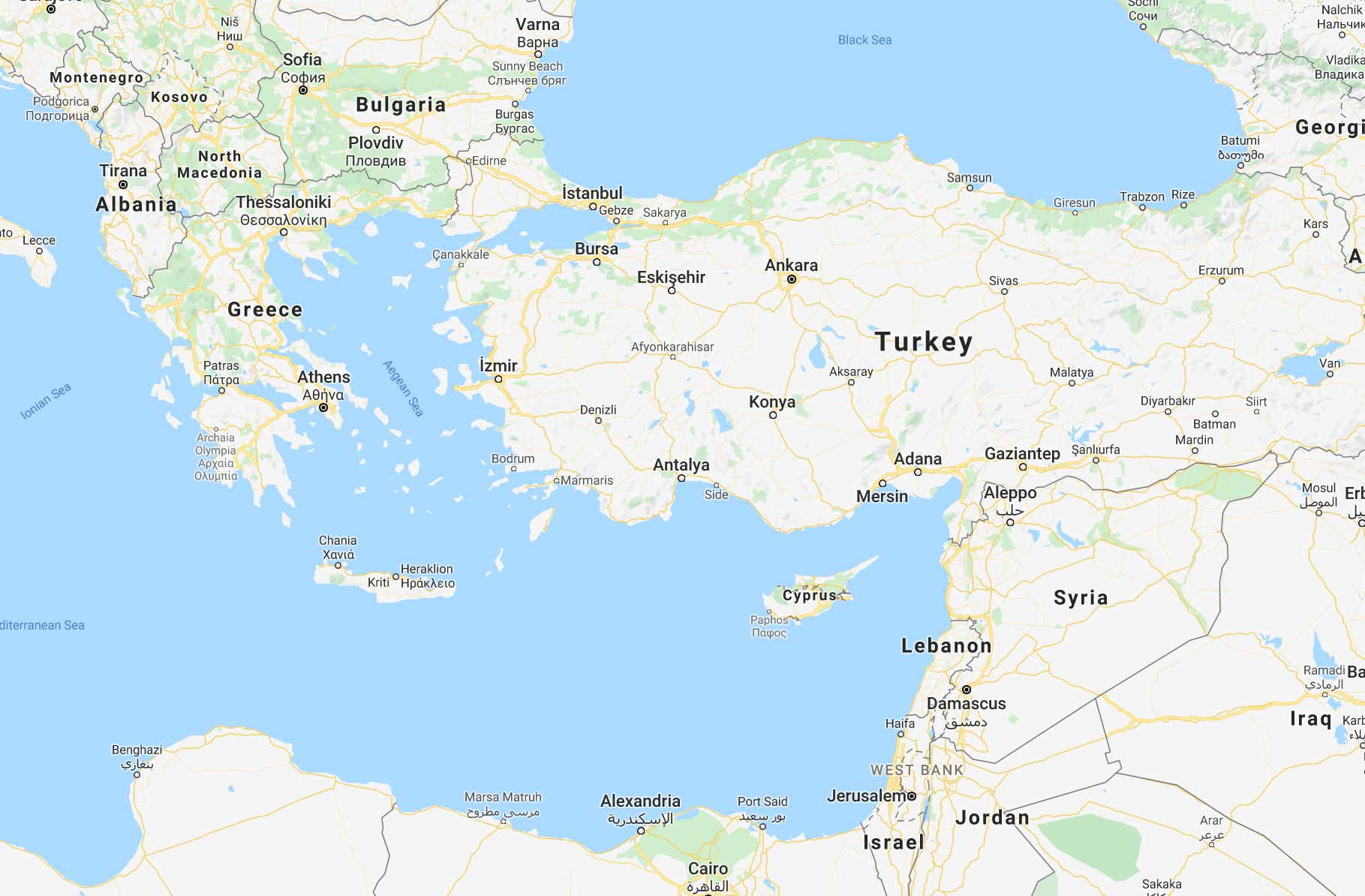 A current map of Greece, Turkey, and Macedonia.