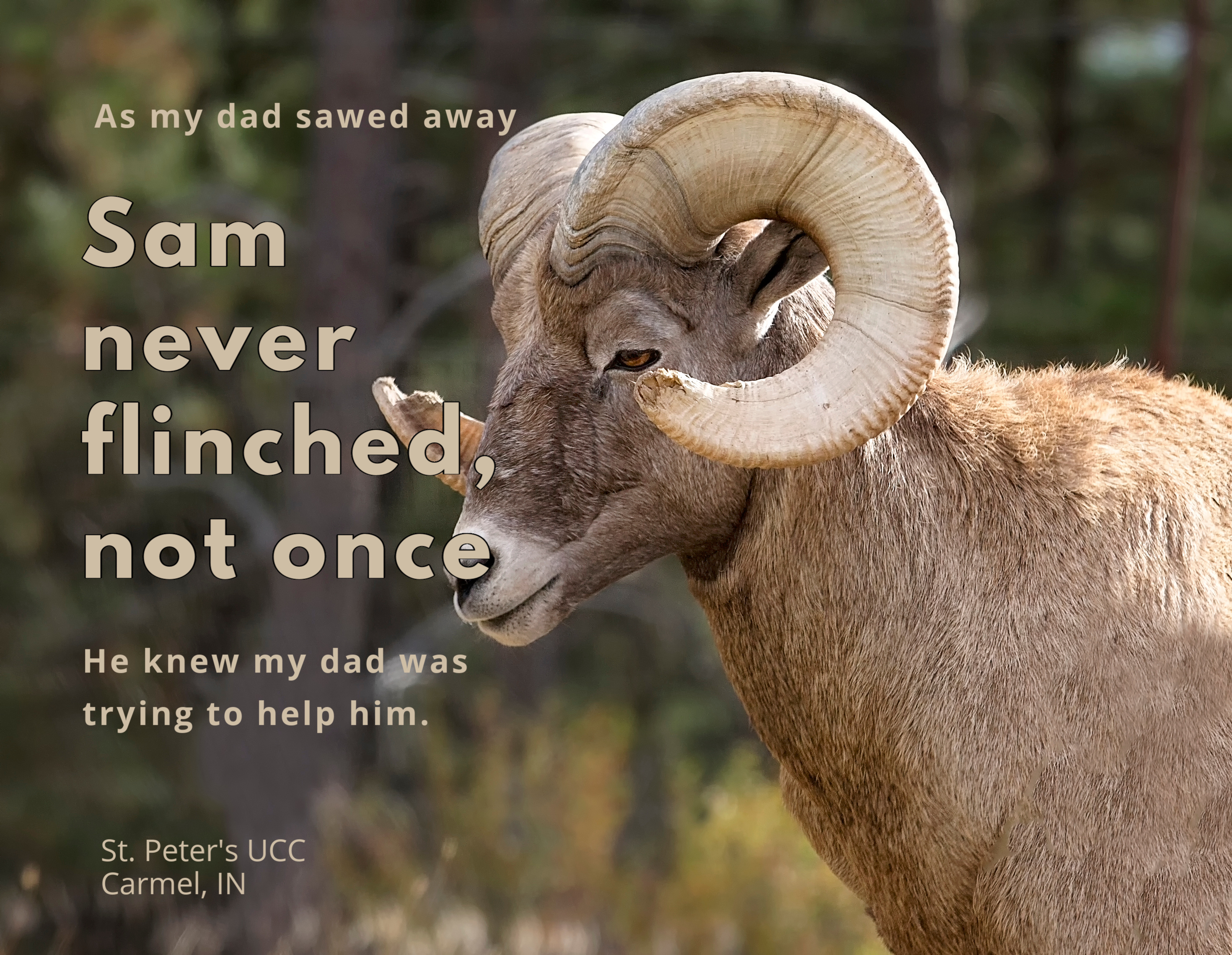 Later on, long after Sam went to sheepy heaven, my dad would tell us stories about him. One such story has stayed with me these many years later and reminds me vividly of our scripture passage today. As I mentioned, Sam had big ram horns, so big and long that eventually they became a threat to his sight and eyes. One day my dad held him firmly and gently and “trimmed” his ram horns. The beautiful part of this story and memory, is that as my dad sawed away, Sam never flinched, not once. He knew, he sensed, what my dad was trying to do. He knew my dad was trying to help him. So despite the saw being very close to his face, he remained still.