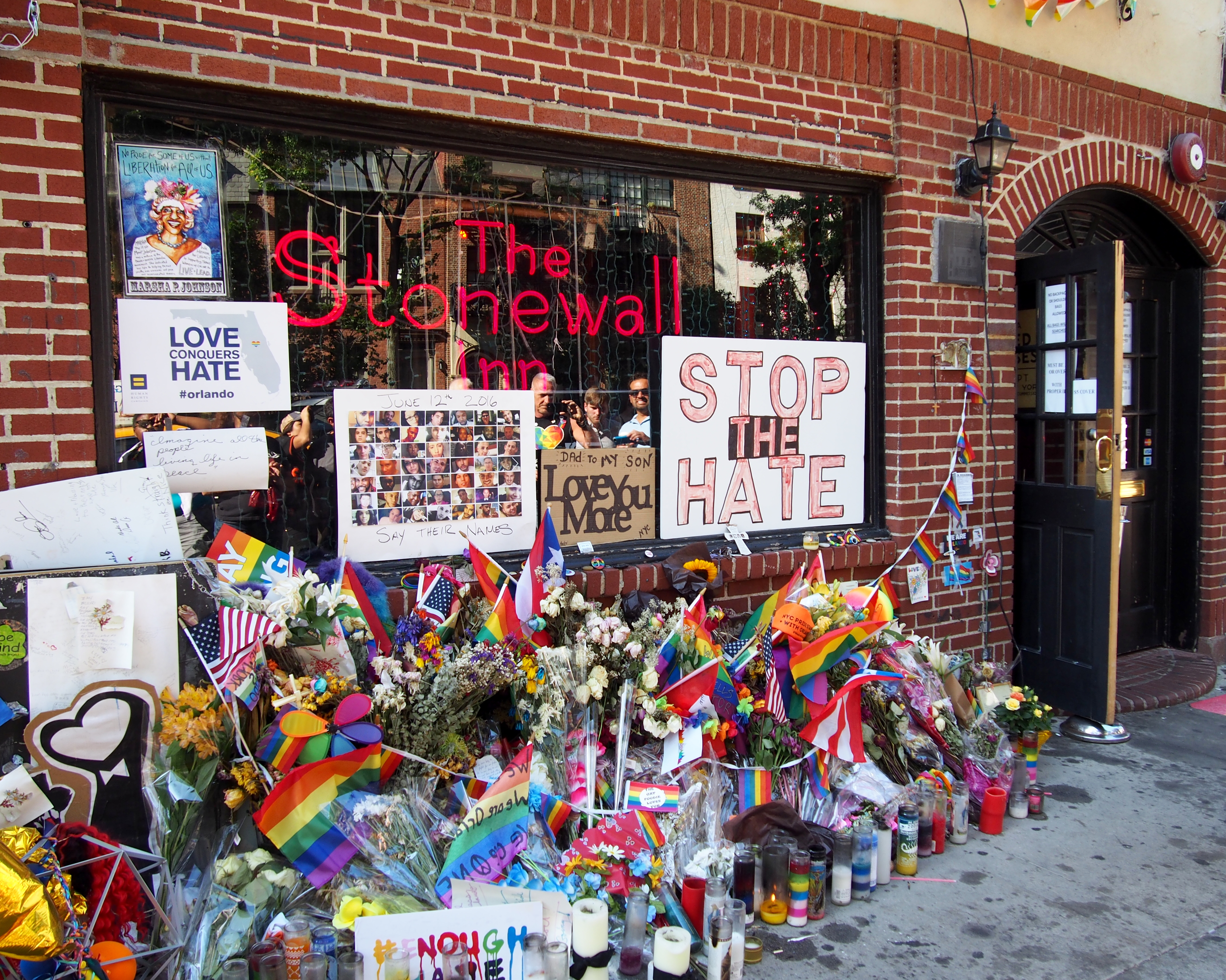 Stonewall Inn, a gay bar on Christopher Street in Manhattan's Greenwich Village. A 1969 police raid here led to the Stonewall riots, one of the most important events in the history of LGBT rights (and the history of the United States). This picture was taken on pride weekend in 2016, the day after President Obama announced the Stonewall National Monument, and less than two weeks after the Pulse nightclub shooting in Orlando. Source: Rhododendrites