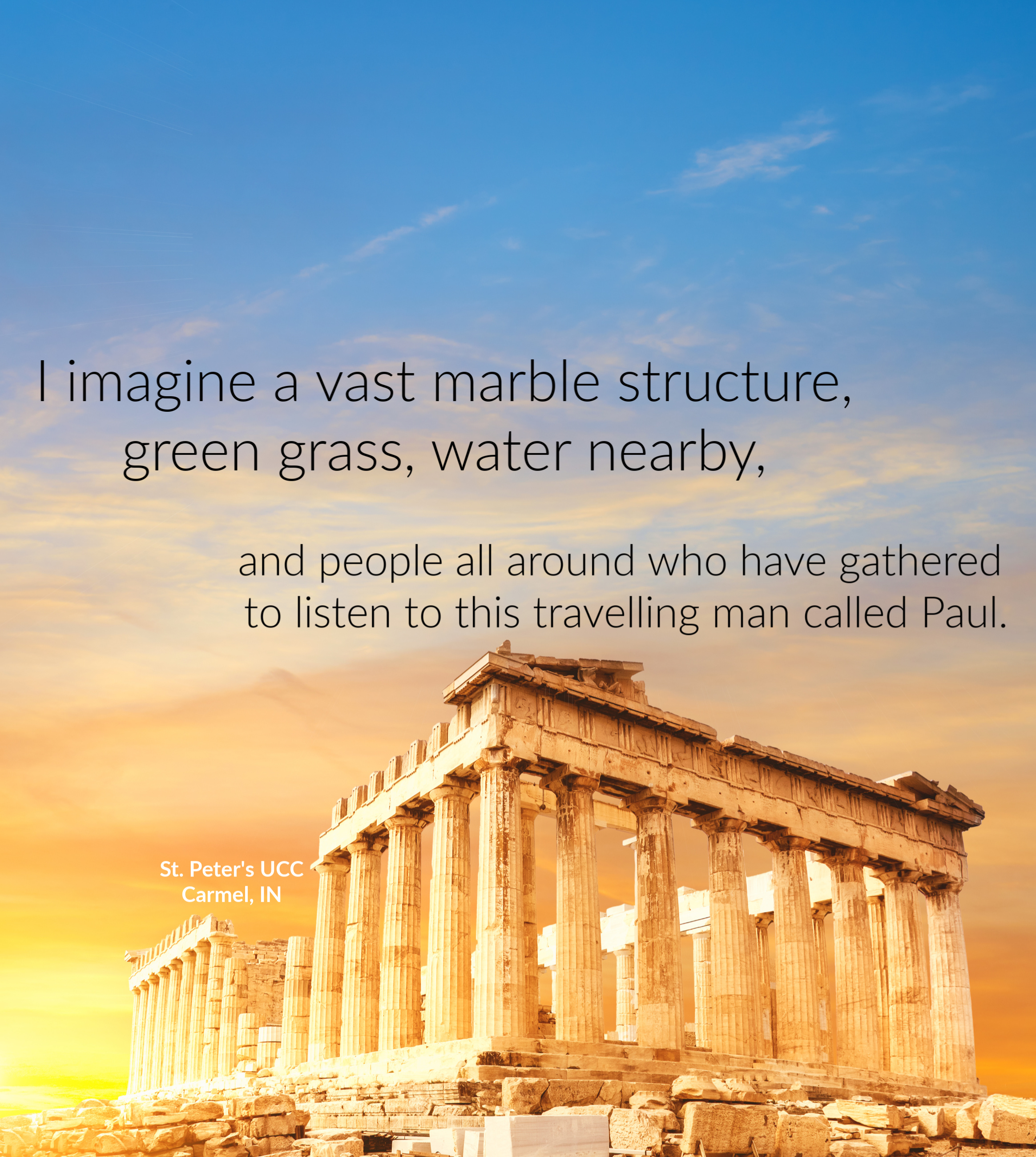 Imagine with me, an ancient Greek scene. We’re sittng or standing on a slight hill, just below the Acropolis, the temple dedicated to the Goddess of Wisdom, Athena. I imagine a vast marble structure, green grass, water nearby, and people all around who have gathered to listen to this travelling man called Paul. The people of Athens were accustomed to gathering at this spot for conversation, lectures, and poetry. Paul was well versed in different cultures and was able to move and talk to those around him with eloquence and cunning. He used their language, their poetry, their philosophy as a way to ease their minds and lead into a more challenging conversation. You see, Paul came to talk about his faith. God and this man named Jesus, who Paul claims died and was resurrected. That was just one step too far for the people of Athens. So Paul gathered them at this familiar spot and the conversation began...