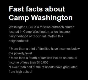 What does it mean to be a mission outreach church? Here are some of the ways that WUCC cares for the community of Camp Washington: