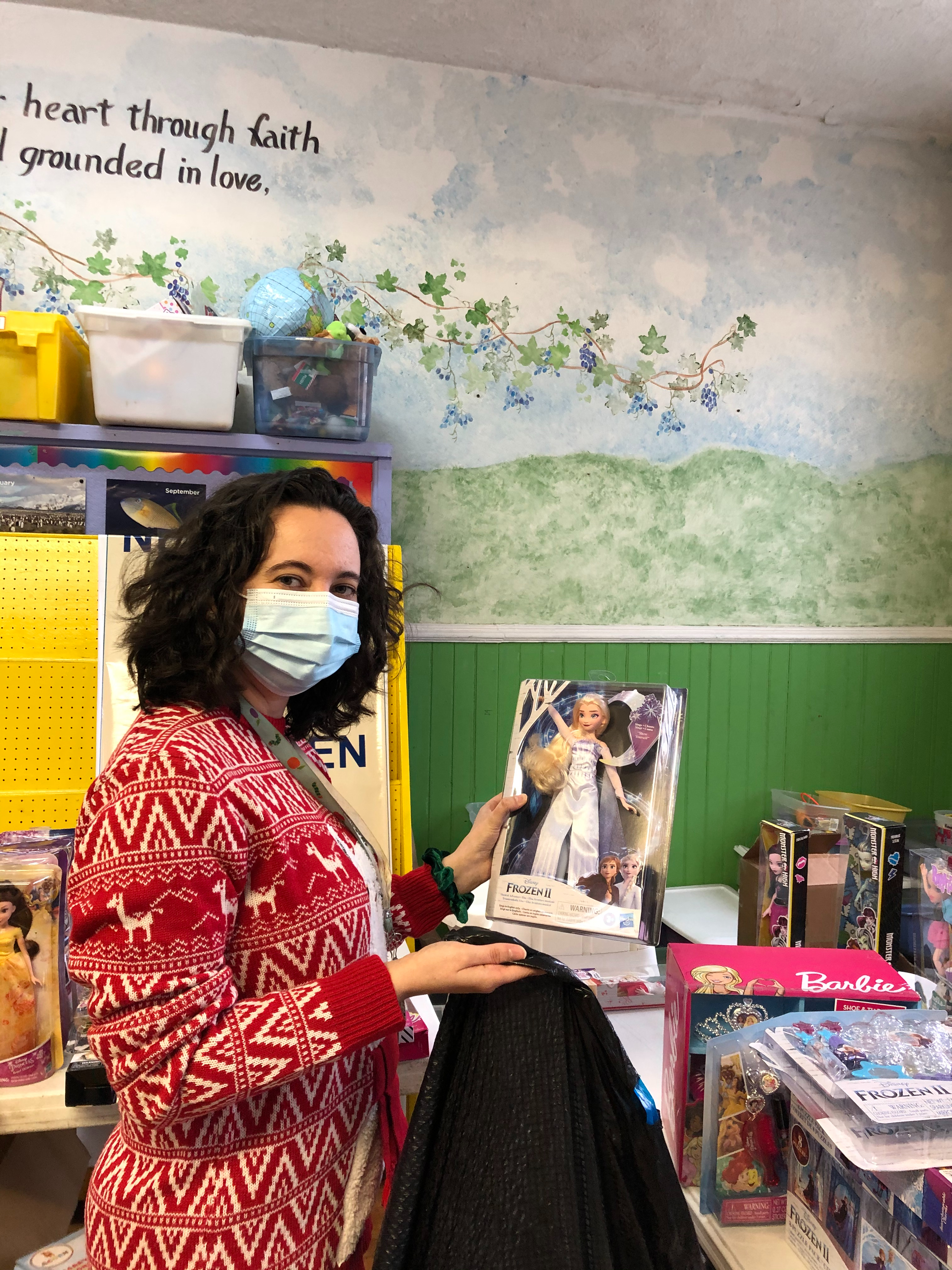 ● Every year, we create a Nativity using toys in the store. Joy is seeing Elmo as Baby Jesus.