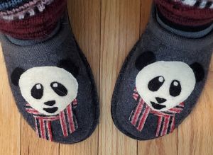 “Almost all people feel compassion and love when they see a panda, either alive or on television.” Or on feet. “The panda appearance might be a sign that you should nurture yourself and your loved people more.” Yep. That’s what I’ve been feeling quite acutely during this wilderness season. “Wisdom is also one of the traits typical for the Panda. When there is a problem, the Panda will stay calm and determined. It is known that the Panda also symbolizes peace and harmony.” I’m trying, Friends. I’m trying to stay calm and determined. It’s wise counsel, even from slippers.