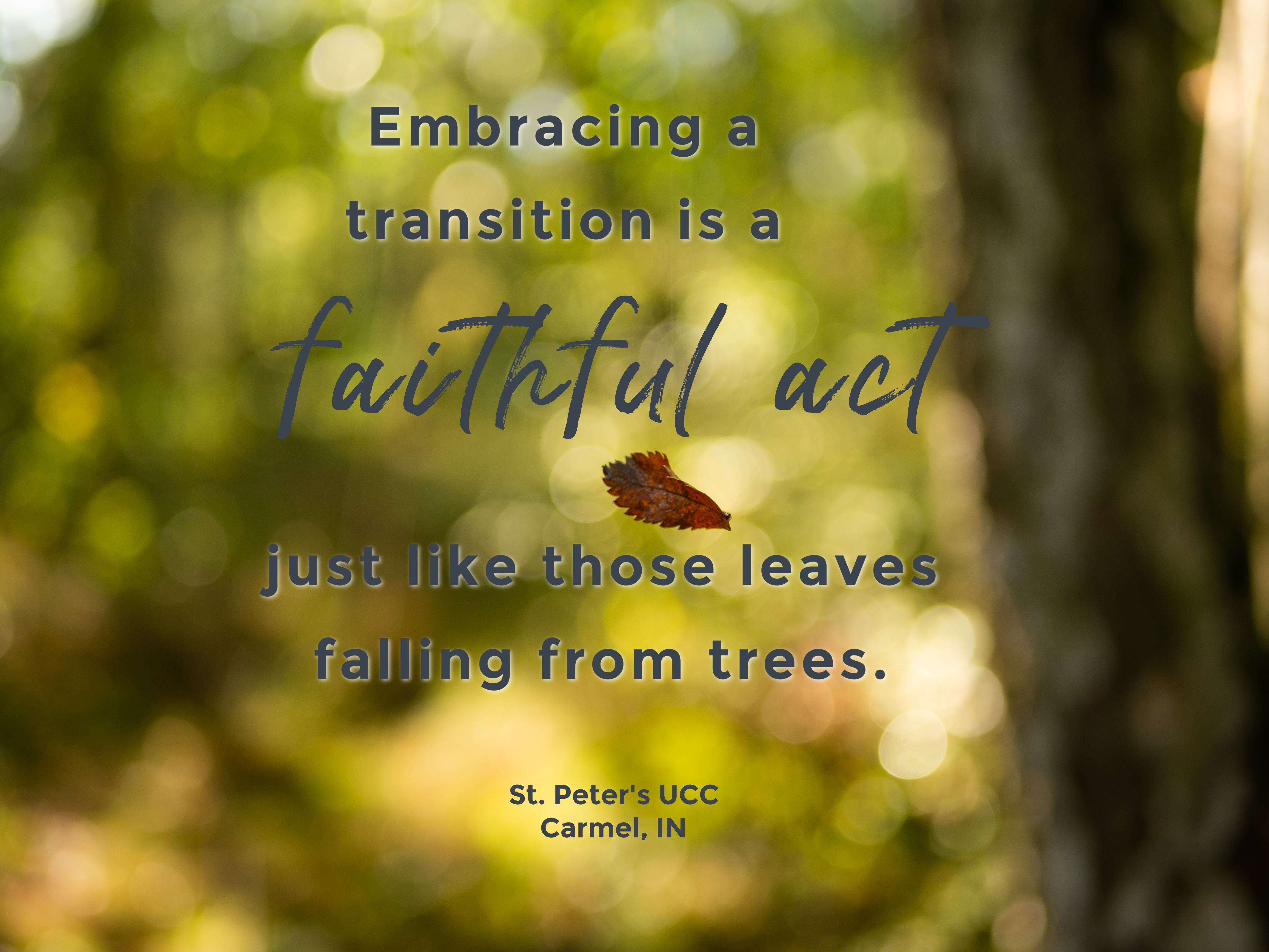 As I honor the unanswered questions, the unsettled feelings, the uncertain future, I am met by God’s love for all. I hear and see echoes of affirmation in the natural world around me. Embracing a transition is a faithful act, just like those leaves falling from trees. Standing tall and proud is a spiritual practice, just like the trees that are soon to be seen without their leaves obscuring their basic structures.